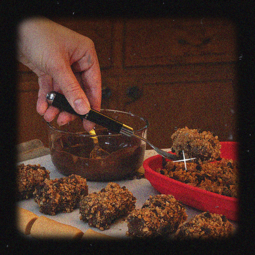 Remove one-third of peanut butter rounds from refrigerator. Using 2 forks, dip and roll each in melted candy coating, allowing excess to drip off. Immediately place in granola coating; sprinkle to coat. Store covered in refrigerator